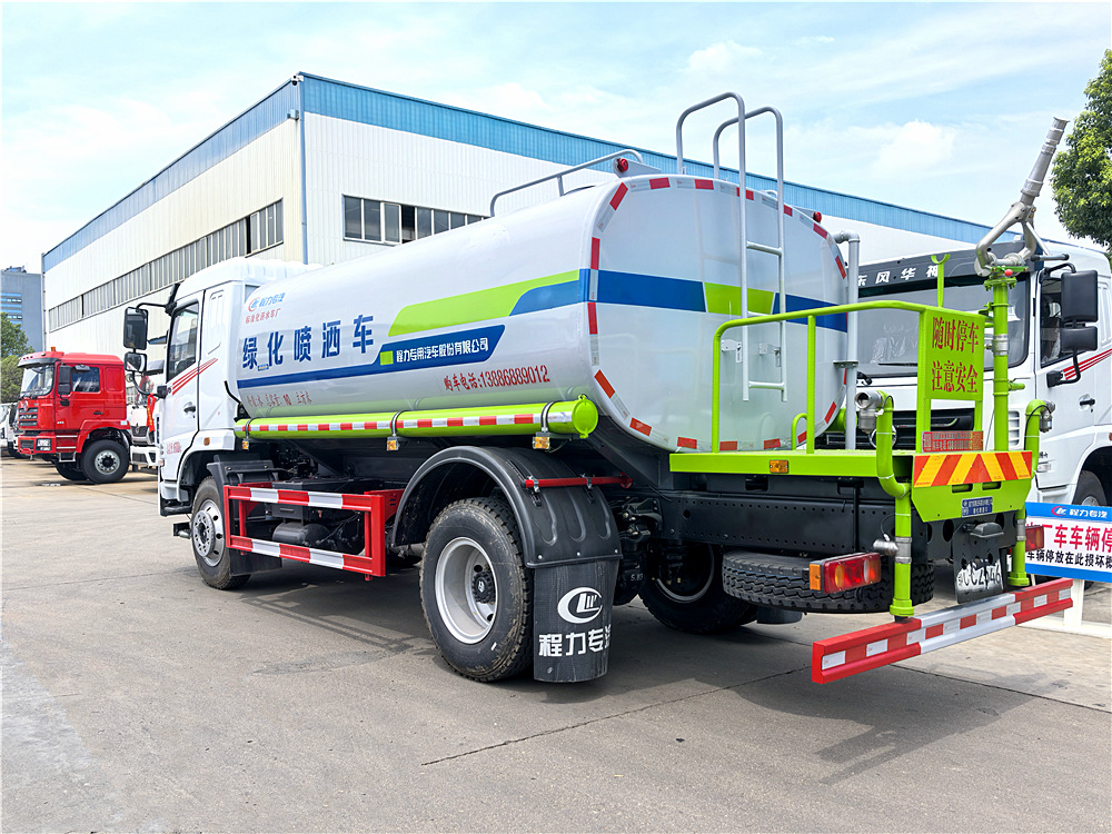 上裝配置:罐體采用國標Q235碳鋼,罐體厚度4mm,前后封頭5MM加厚型,罐體實際容積12立方(12噸),產品質量成熟可靠,設計先進合理,比同類灑水泵壓力大、吸程遠、使用壽命長,可泵進泵出。前沖、后灑、側噴,消防栓接口,帶后工作平臺及綠化高炮(可全方位旋轉,可連續調成直沖狀、大雨、小雨、毛毛雨),水位計,兩根等長輸水管,其余標配。